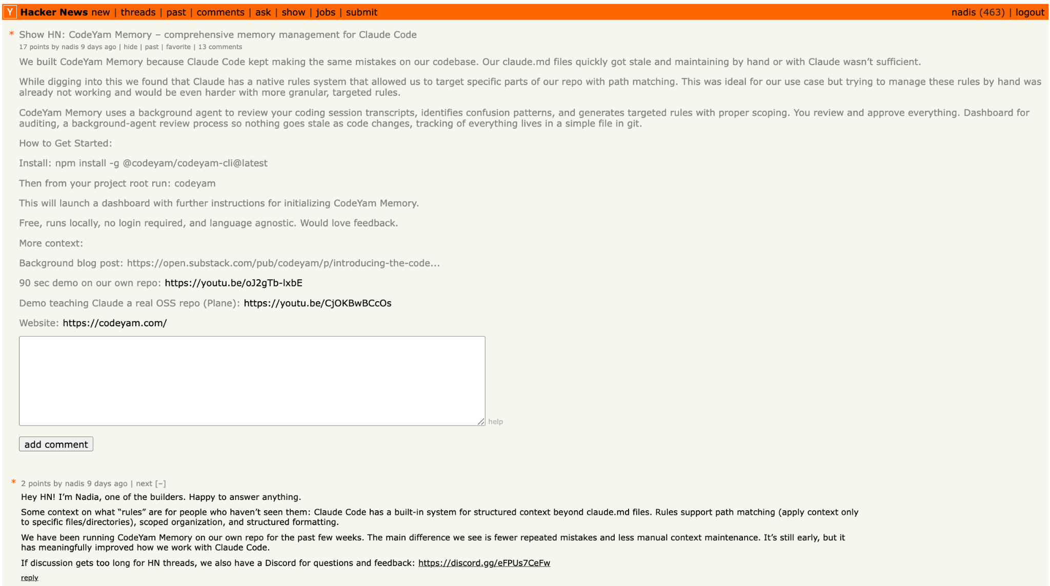 We had also been advised that sharing a direct link to a launch on HN could lead to throttling. So instead we asked people to find the post themselves from the main HN site or, as became increasingly necessary, search for “codeyam” and locate the most recent post.