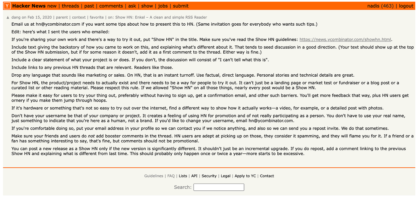 In a move of desperation to at least give our launch a chance to be seen by anyone who might try what we built and find it useful or at least share feedback, we emailed friends and our investors and asked them to look for our launch and, if they had something meaningful to say, engage in the comments. Not that Hacker News strongly discourages this, in contrast to Product Hunt which encourages you to amplify your launch.
