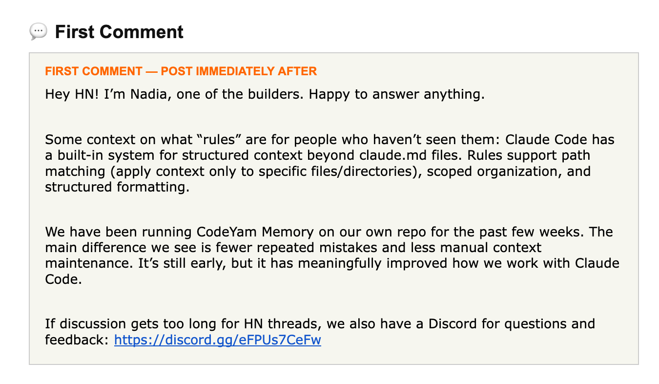 We drafted our Show HN post in advance along with my first comment as a maker. I also asked Anthropic’s Claude AI to analyze past launches to help aim for the right style and length, and repeatedly checked the Show HN guidelines and tips.